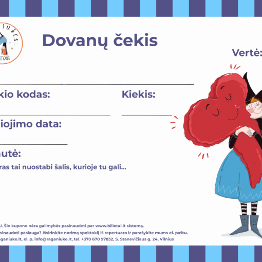 Dovanų čekis suteikia puikią progą pačiam išsirinkti norimą prekę ar paslaugą Raganiukės teatre. Rinkitės iš daugiau nei 50 pasiūlymų. Jums telieka išsirinkti sumą ir dovana jau jūsų rankose.Dovanokite akimirkas kartu!